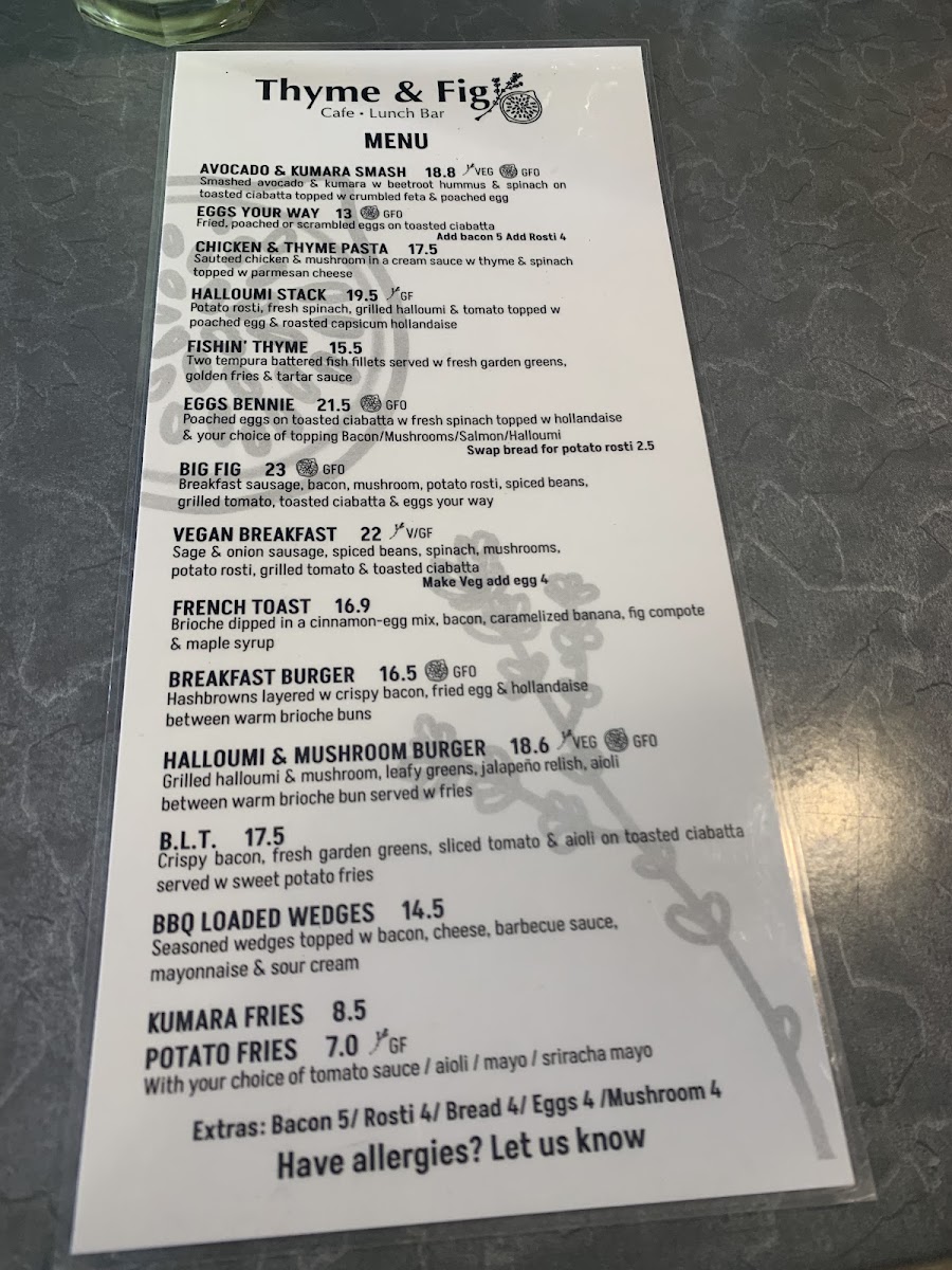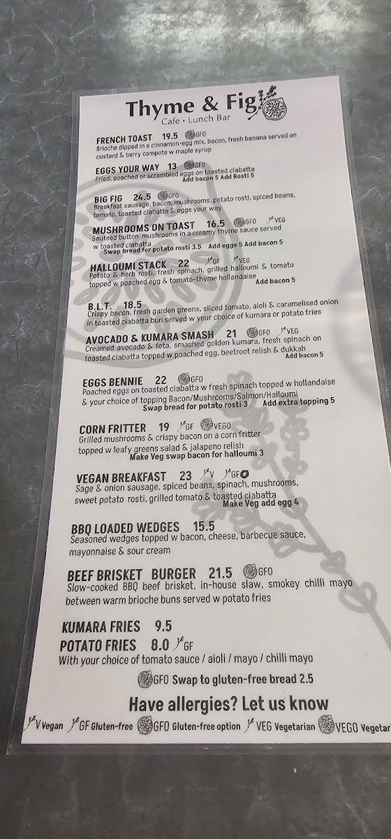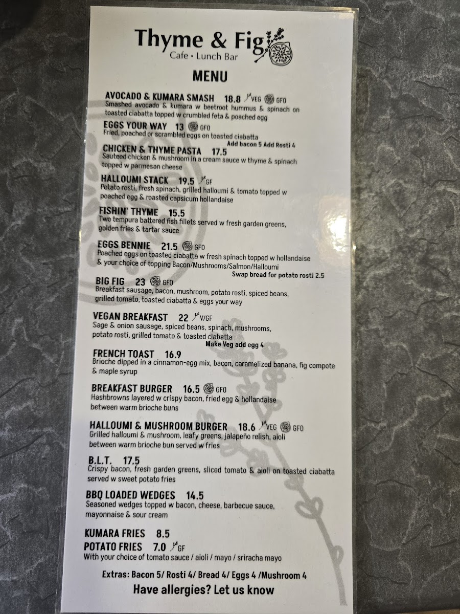 The menu at Thyme & Fig Cafe/Lunch Bar offers a variety of options suitable for breakfast, casual dining, and coffee breaks. The selection includes a range of hot coffee beverages like flat white, cappuccino, and long black, alongside teas such as Earl Grey and peppermint. Smoothies are also available, featuring choices like avo matcha and mango lassi, with optional add-ons such as hazelnut syrup.
