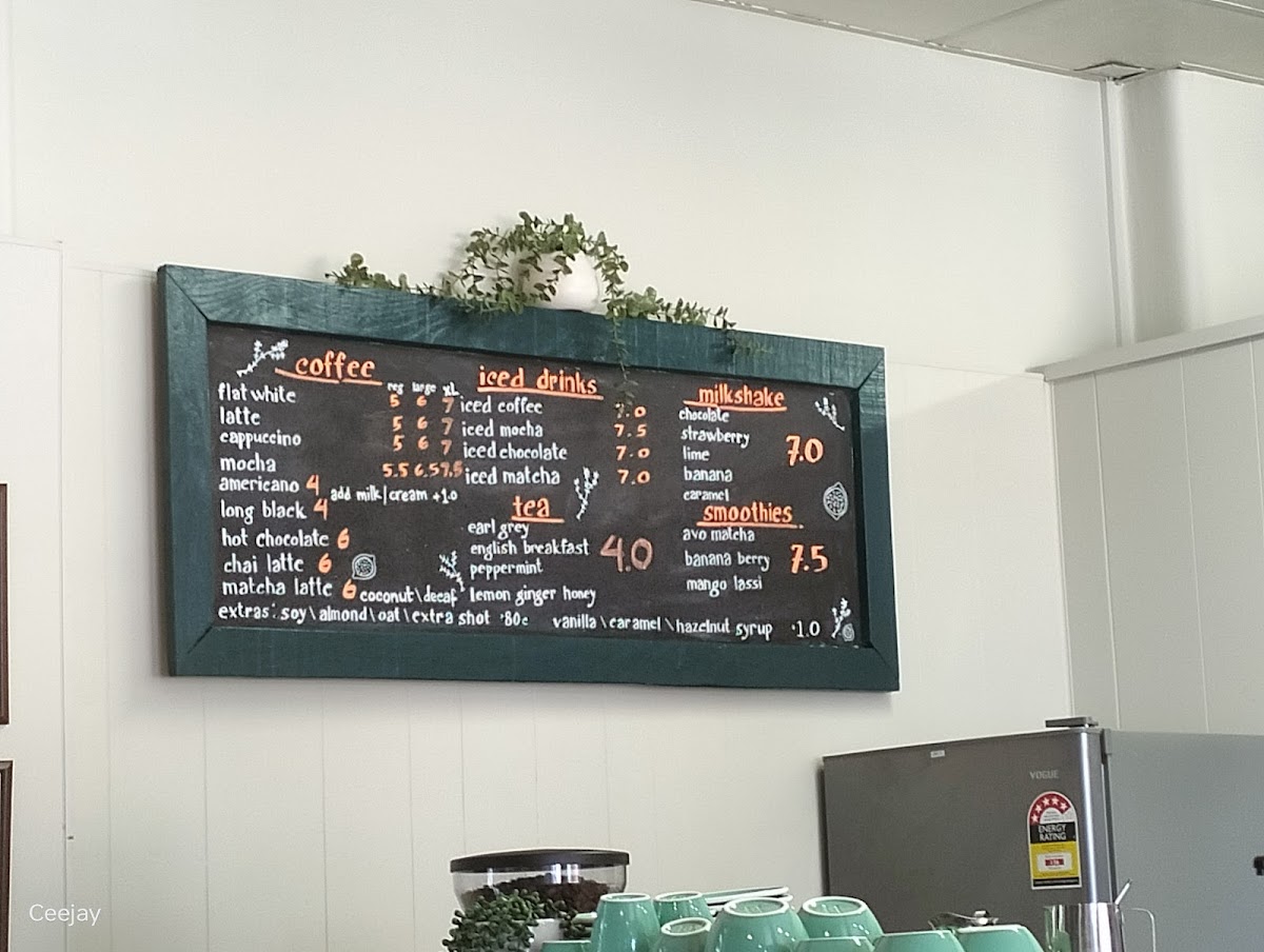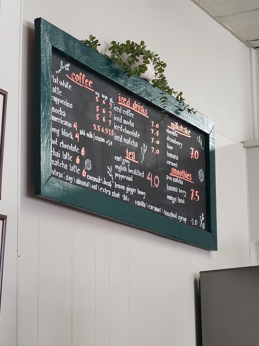 Food items focus on breakfast and light meals, with highlights including classic dishes like eggs Benedict, French toast, and a halloumi stack. The menu also features a big breakfast option for those seeking a more substantial meal. For dessert or snack options, there are items such as a coconut lemon slice that is gluten-free.